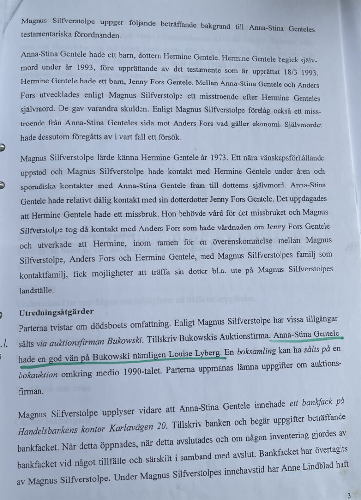 Det väcker obehag hos mig när jag läser att det ”enligt Magnus förelåg också ett misstroende från Anna-Stina Genteles sida mot Anders Fors vad det gäller ekonomi.” Att boutredningsman Christer Magnergård hade mage att lägga in detta i hans utredning och inte skriva en rad om att Magnus den 18 mars 1993 blir universalarvinge till Anna-Stina i testamentet som då upprättades endast 2 månader efter Hermines död.
